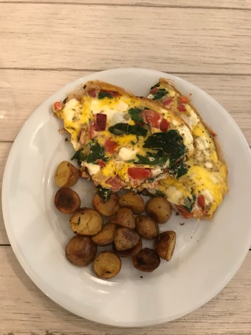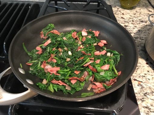 The second frittata I made was a little more filling. This time I began with some diced bacon (canadian bacon or ham would be even better) and a small chopped onion. When the bacon and onion was nice and brown in my oven-proof skillet, I added a few generous handfuls of spinach and 2 diced Roma tomatoes.