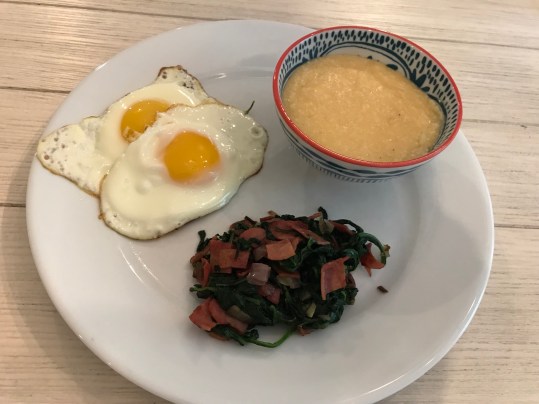 As for the last breakfast of deliciousness: slow-cooker grits with fried eggs and sauteed spinach. I poured into my slow cooker: 6 cups of water and 1 1/2 cups of plain corn grits (not the quick-cooking kind), plus a half teaspoon of salt. I stirred the water and grits together until they were smooth, and the salt. You want to make sure there aren’t any lumps; if you have had lumpy grits before, there is nothing worse than eating a lump with dried grits in the middle! You can just follow the directions on the side of the grits container if you want to make less: